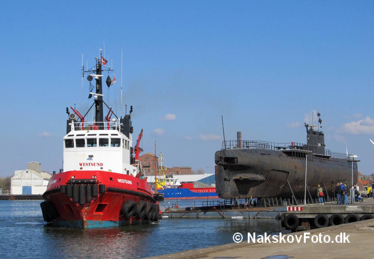 Det tog de to slæbebåde, Westsund og Baltsund, og havnebåden, godt en times tid, at få ubåden fri, af fortøjningerne, og vendt ubåden, så motorerne var forrest, når den skulle bugseres til Frederikshavn.